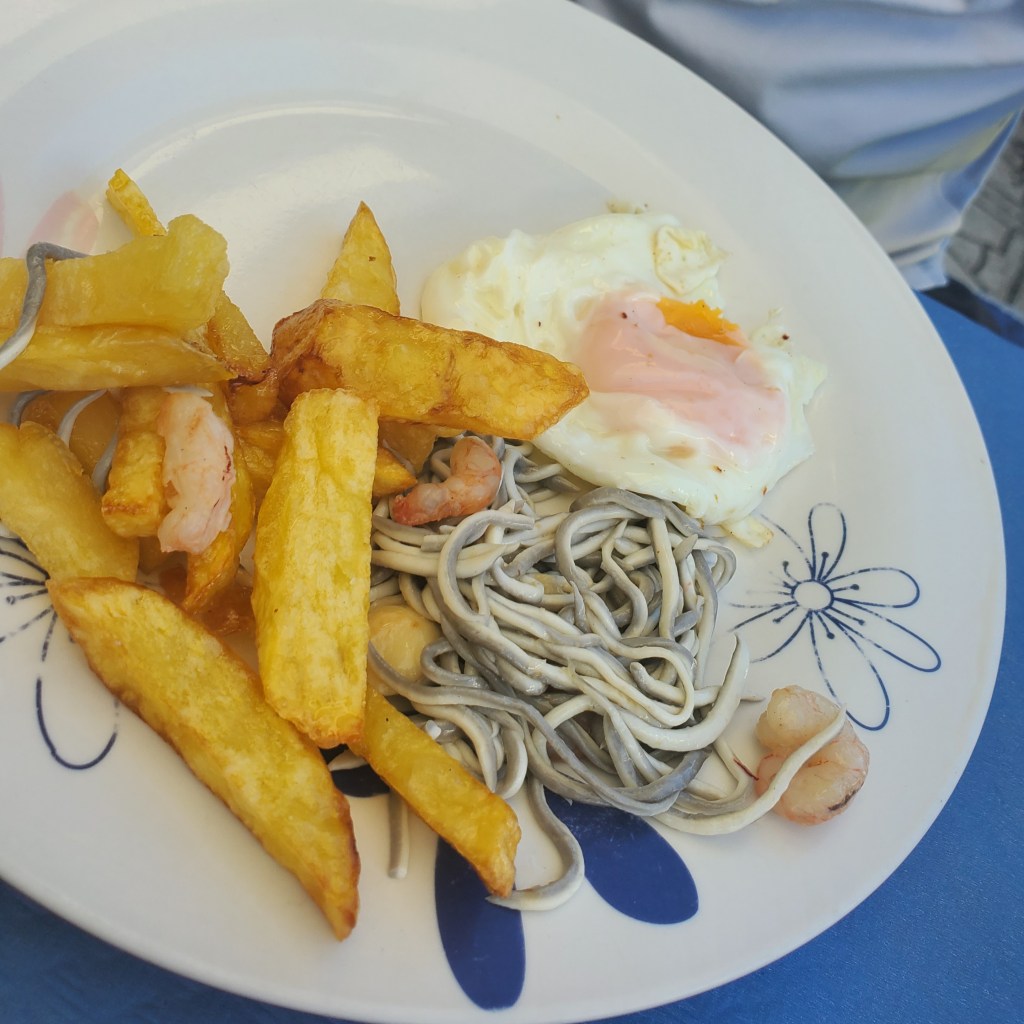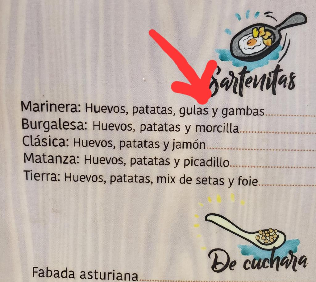 This is where I committed mistake #22: failure to translate each word on the menu. (This rule also applies to road signs). I first did some quick translation of the menu words I did not recognize. For example, I learned that morcilla was blood sausage, something that would have been good to know before yesterday’s lunch. Cleverly avoiding the Burgalesa, (eggs, potatoes, and blood sausage), I chose the Marinara, (eggs, potatoes, and shrimp). But those who read the fine print will note that I missed the word “gulas.”