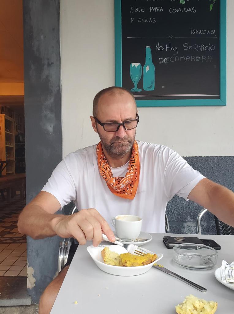 First breakfast was just below our lodgings. Handy, quick, and tasty, with a glimpse of a seldom experienced morning smile from our server.