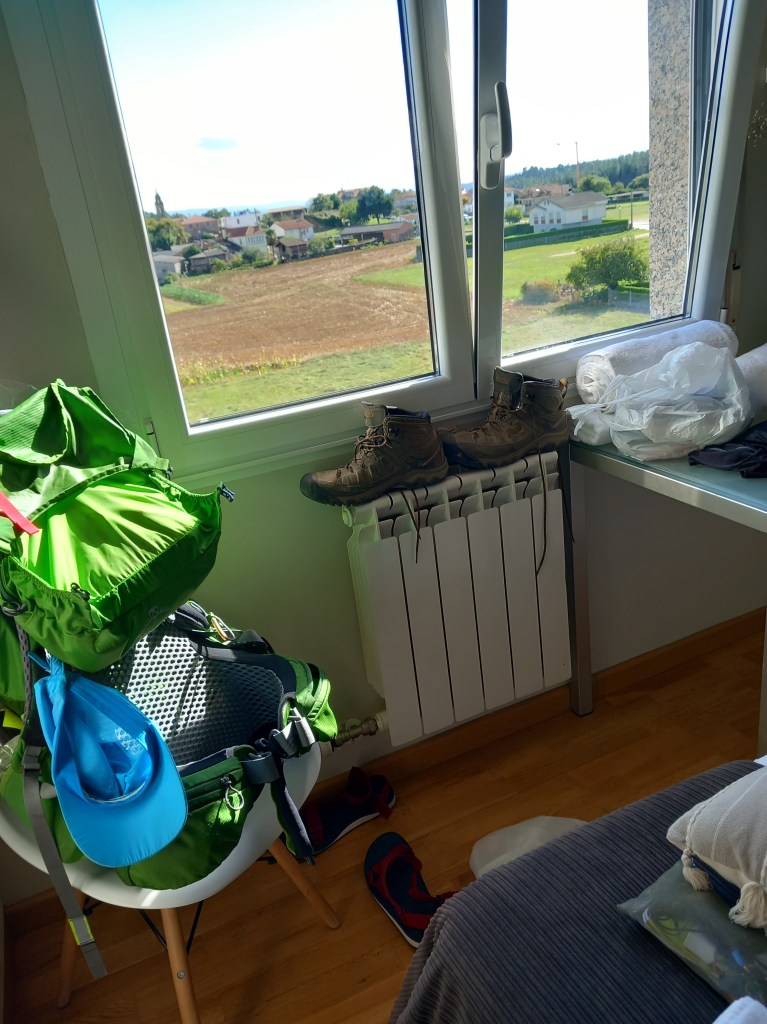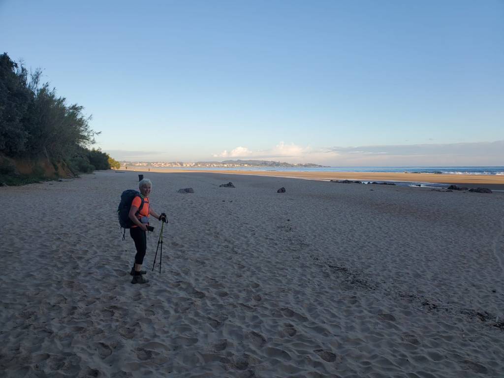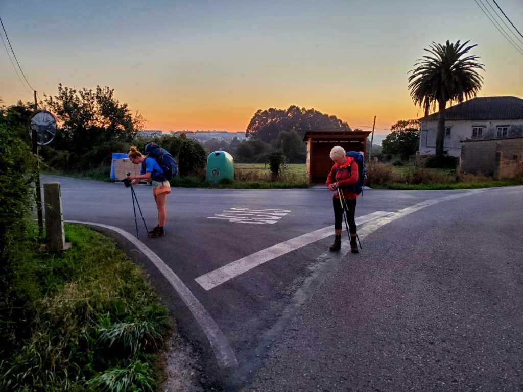 After our stroll, we began to remember all of the learnings we had forgotten, some of them from Camino 101. The first: if you are in a town that does not cater to pilgrims, a sit-down meal during Spanish lunch time (between 1:30 and 4:30) might be too early, but dinner (starting at 8 pm) will undoubtedly be too late. And many grocery stores are closed for siesta, or on Sunday, the entire day. We therefore got a jump start on our consumption of bread and chorizo and ate a sandwich on the beach for dinner. This learning was followed by a few others. Put your ear plugs in every night. Try and get a room with two single beds. Use the pillow and blankets you packed instead of wrestling with the sheet on the “couples” bed you were allocated. Close the external blinds to help block out the noise from the rooster who is confused between sunup and 2 a.m. Basic stuff. With very little rest, we began our walk at 7 a.m.