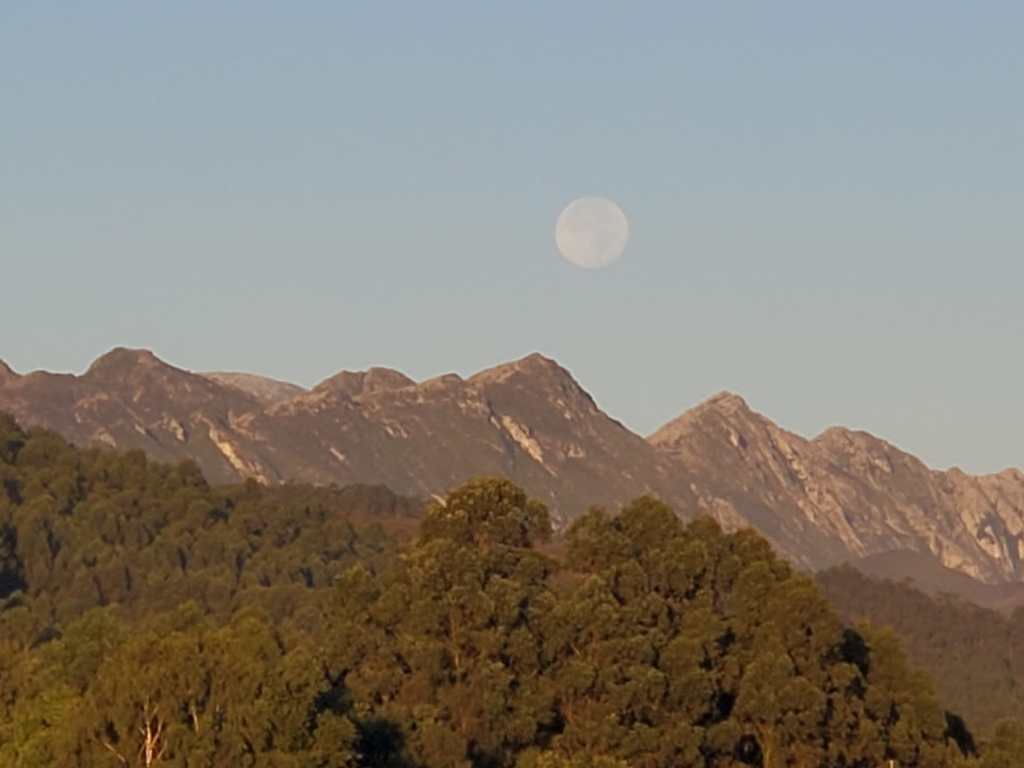We hit the road at 6:45 this morning in time to see the full moon over the harbor. The temp was mild with a cool breeze – perfect for the steep hill leading out of the village.