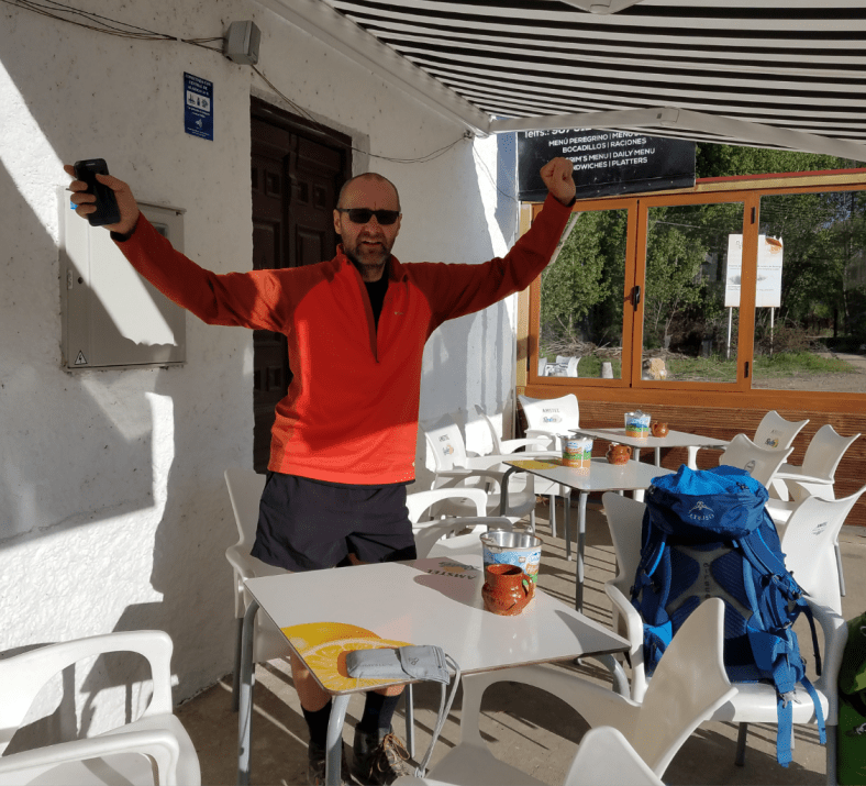 Sadly, the 2 bars in town were closed after we freshened up. And the closest restaurant was 1 km away. We therefore headed over to the supermercado down the road to see what we could buy. Like a magnet we discovered that the supermercado was an underground pub and restaurant. Buy your beer, wine and snacks and the owner will put it together for you on a plate. All served on the terrace decorated with pilgrim flags. Fantastic.