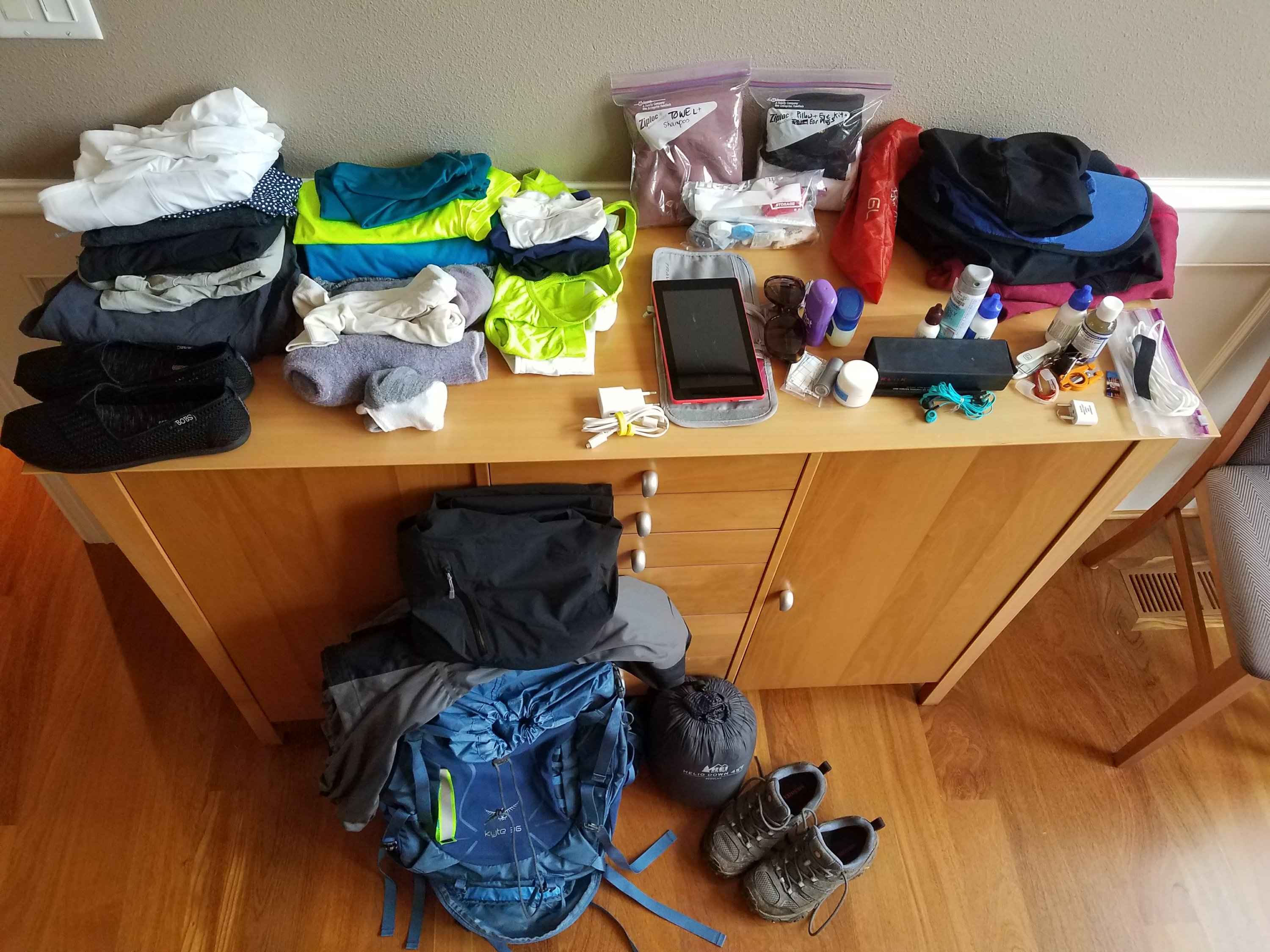 - outerwear: 1 fleece vest, 1 light fleece hoodie, 1 Columbia rain jacket, 1 rain pant
