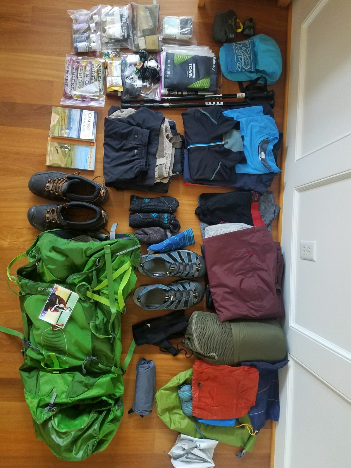 Starting the Camino Frances in May means you have to be prepared for everything: from hail to heat. This makes packing somewhat problematic. The goal for me was to pack what I “need” into 15 lbs / 7 kg or less. This includes my spiffy new Osprey pack. At 3.2 lbs that leaves me just about 12 pounds for the stuff. Robby purchased the Osprey Atmos 50 AG “Anti-Gravity” unit. His goal is higher, which dovetails in nicely with my devious plan to have Robby carry more water. And he has generously offered to carry shared items. Of course this means that I intend to share as much as possible. A toothbrush and toothpaste is for sharing, right?